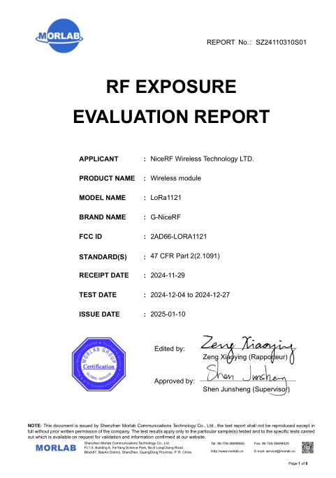 Informe de certificación completo. Haga clic para ver el archivo adjunto detallado de Lora1121 .
