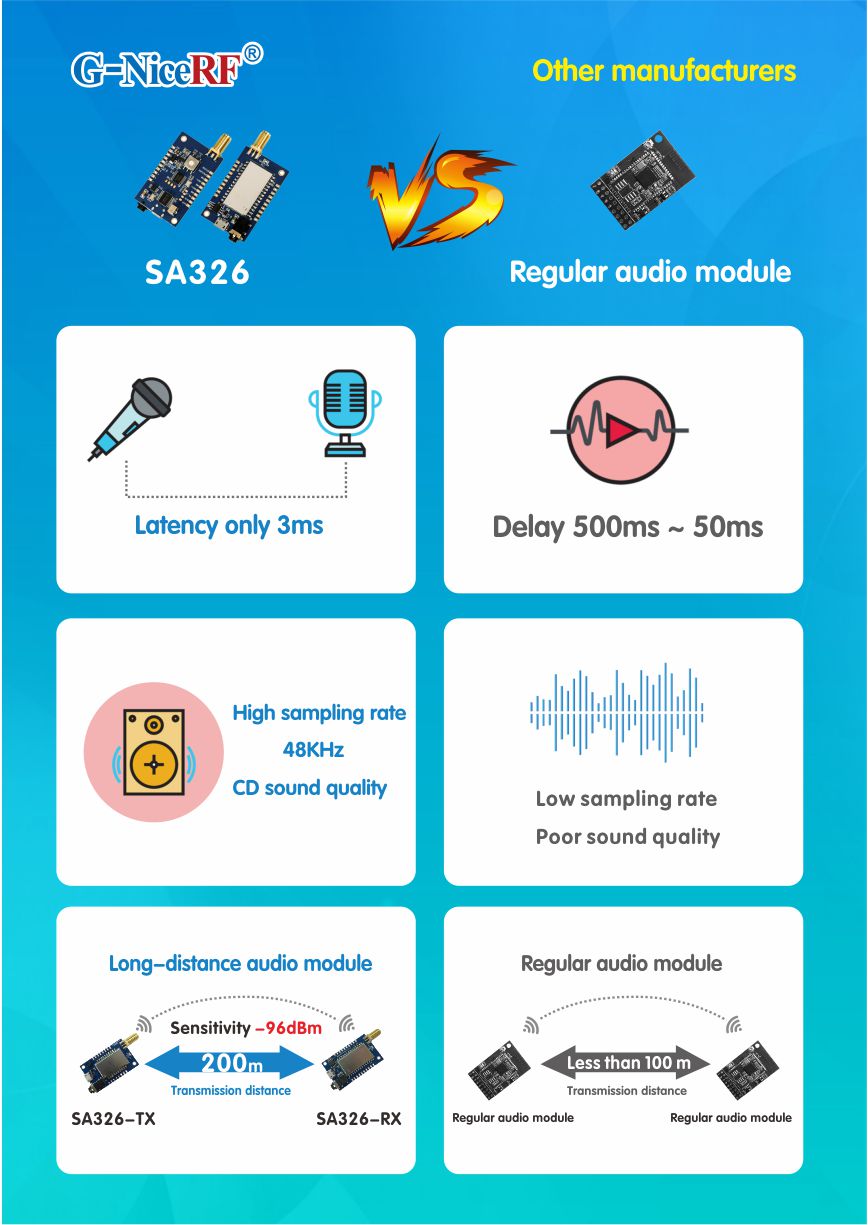 En resumen, el módulo de audio inalámbrico SA316 se destaca en el mercado como una solución líder en transmisión de audio debido a sus destacadas características técnicas como distancia de transmisión ultralarga, rendimiento de recepción superior, audio de alta calidad, rendimiento de baja latencia, modulación digital eficiente, baja ocupación de ancho de banda, velocidad de transmisión rápida y alta frecuencia de muestreo. Ya sea en actuaciones a gran escala, eventos deportivos o aplicaciones industriales, el módulo de audio inalámbrico SA316 puede proporcionar a los usuarios servicios de transmisión de audio estables y de alta calidad para satisfacer diversas necesidades.